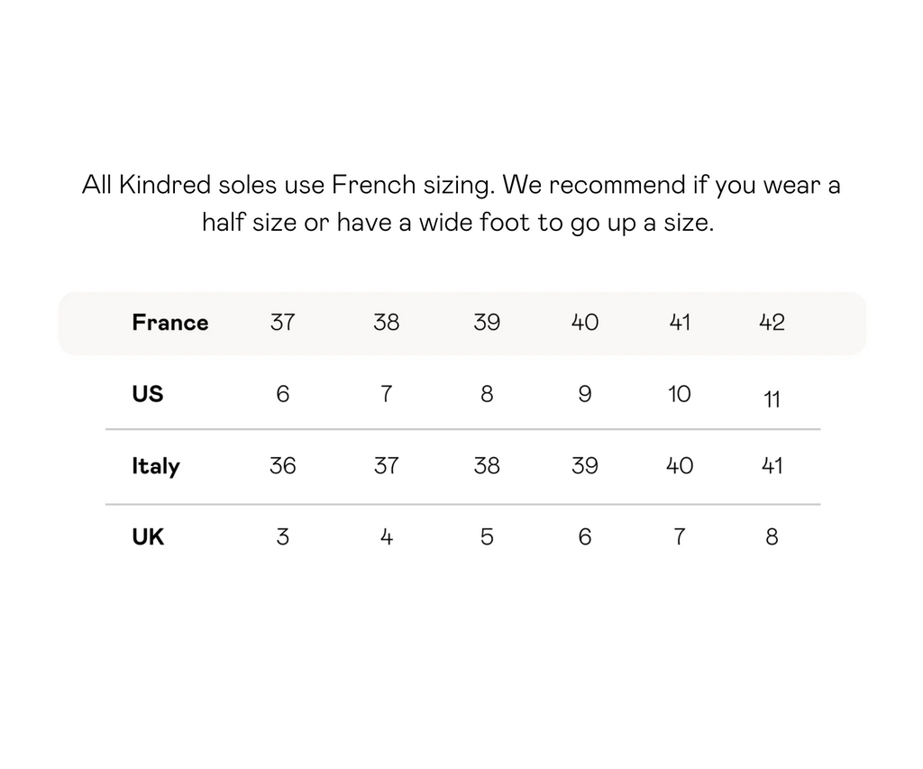 *Our sandals are French sizing- i.e. a US 7= FR 38. See our sizing chart for further conversion. Wider feet or half sizes may want to go up a size.